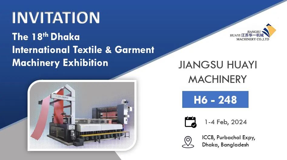 A Jiangsu Huayi Machinery, como empresa líder nacional em equipamentos de tingimento e acabamento, trará seus produtos desenvolvidos da série de lixadeiras e amaciadores de ar para participar da Exposição da Indústria Têxtil em Dhaka, capital de Bangladesh, de 1 a 4 de fevereiro de 2024.