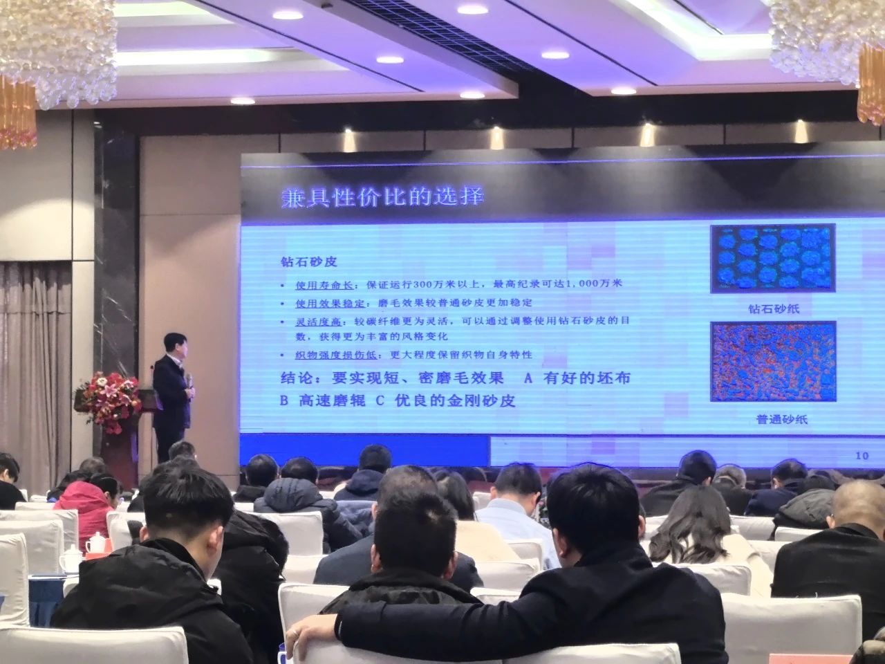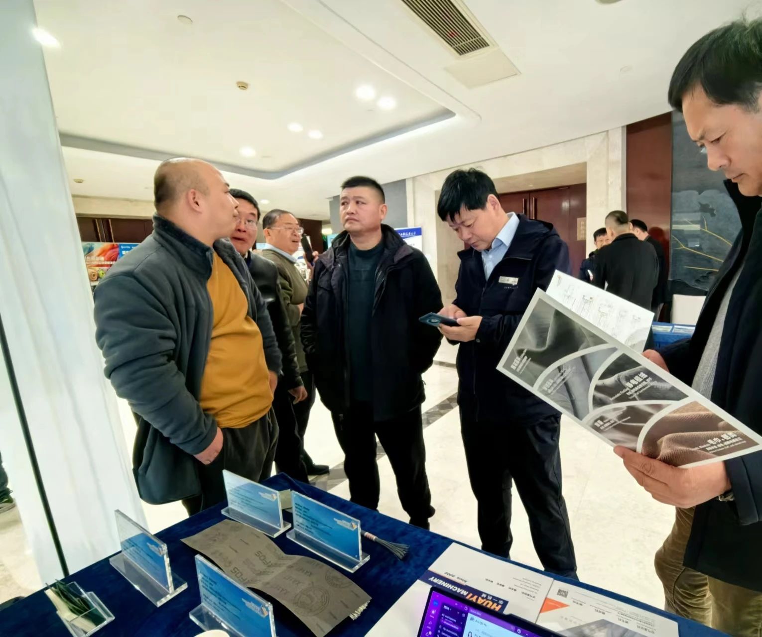 Após a reunião, acadêmicos e representantes empresariais pararam no estande da Jiangsu Huayi Machinery para trocar experiências do setor. Eles perguntaram sobre as máquinas de suedação verticais de alta velocidade e máquinas de amaciamento de ar recentemente lançadas pela Huayi e experimentaram os resultados surpreendentes de suedação (macia, curta, densa e uniforme) no local.